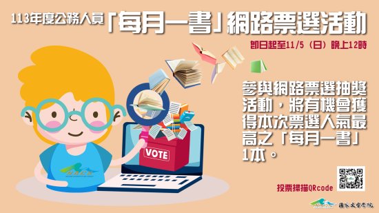 (五)獎勵措施:自全體參與票選活動參加者中,以電腦隨機抽出50名得獎者,致贈得票數最高之「每月一書」圖書1本,預定於112年11月21日(星期二)於文官學院官網公告抽獎結果。